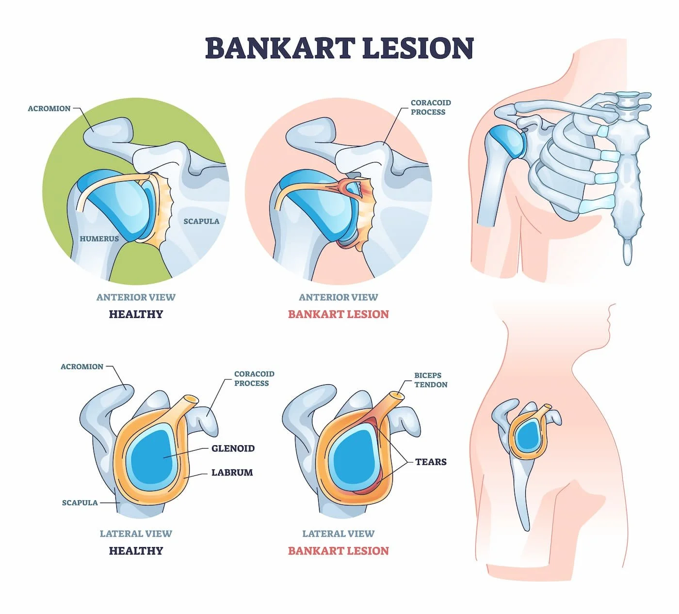 Bankart lesion, a tear in the front-lower labrum of the shoulder often affects athletes in overhead or contact sports, leading to pain, clicking, and a feeling that the shoulder may “pop out.” Diagnosis involves physical tests and imaging such as MRI or X-rays. Mild cases may respond to physiotherapy, while recurrent or severe injuries often require arthroscopic repair or procedures like remplissage or Latarjet. However, with guided rehabilitation, most patients regain shoulder stability and return to sports or normal activities within four to six months.